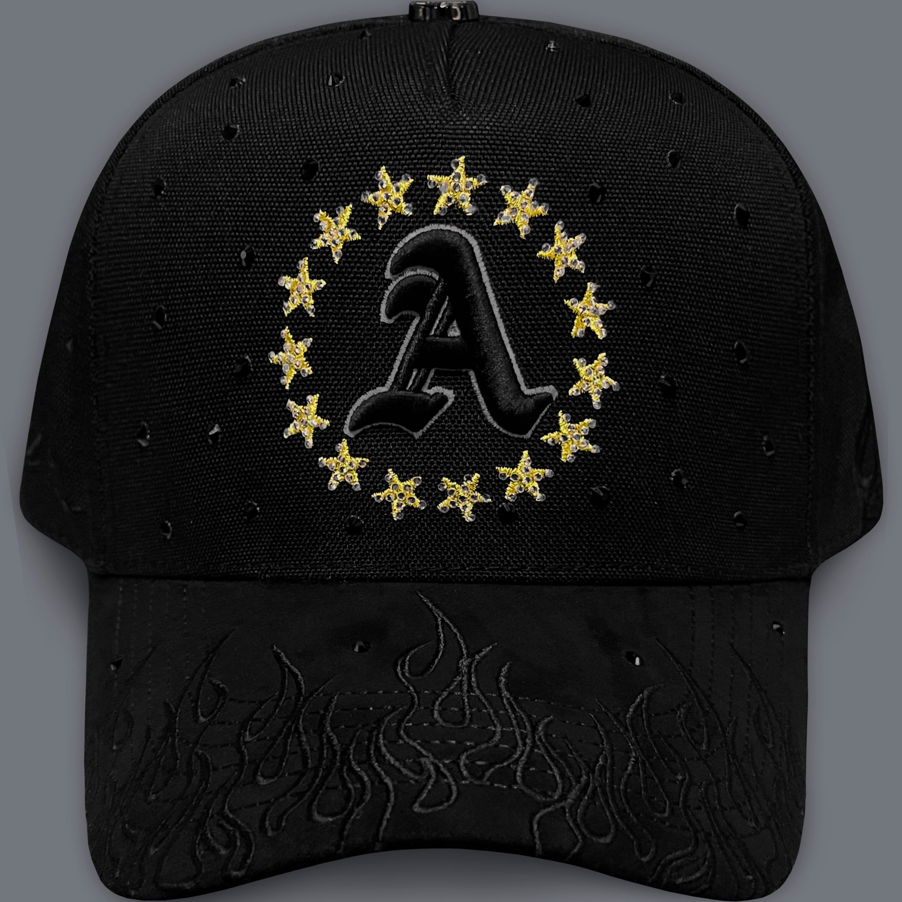 Gorra deportiva con diseño exclusivo que combina la letra A bordada en el frente, rodeada de estrellas que capturan la luz. Los cristales brillantes añaden un toque de elegancia y sofisticación, mientras que las flamas bordadas en la visera crean un contraste dinámico y atrevido. Perfecta para quienes buscan destacar con un accesorio único que mezcla estilo urbano con detalles premium. Un complemento versátil que eleva cualquier outfit con personalidad y brillo.