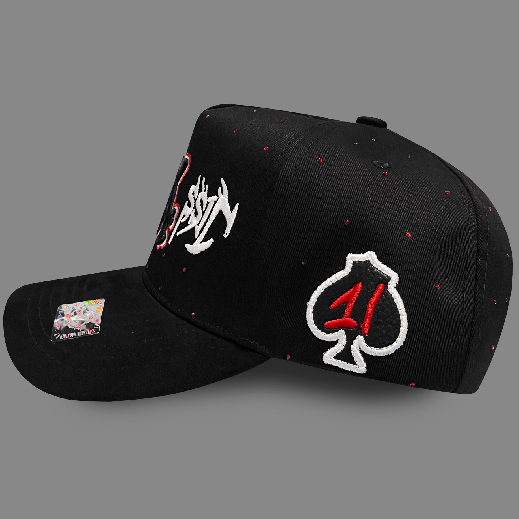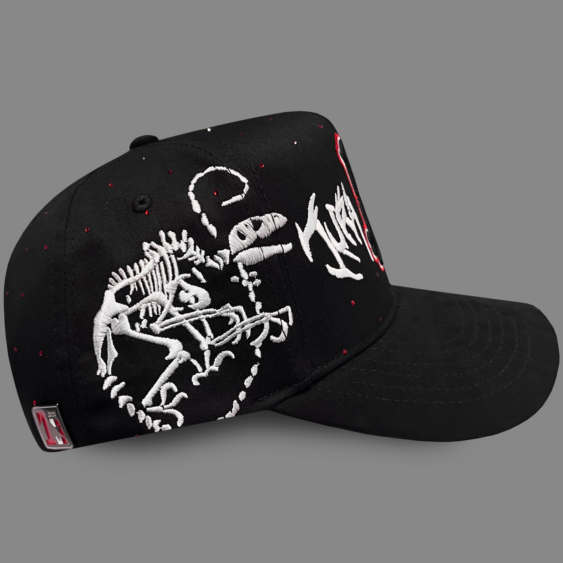 Gorra negra con diseño temático de dinosaurio que combina bordados detallados de huesos y la palabra "JURASSIC" en el frente. Destaca un costado con huesos de dinosaurio bordados, complementados con cristales brillantes rojos que añaden un toque de sofisticación y movimiento. Perfecta para quienes buscan un accesorio urbano con personalidad única y detalles premium que reflejan estilo streetwear audaz.